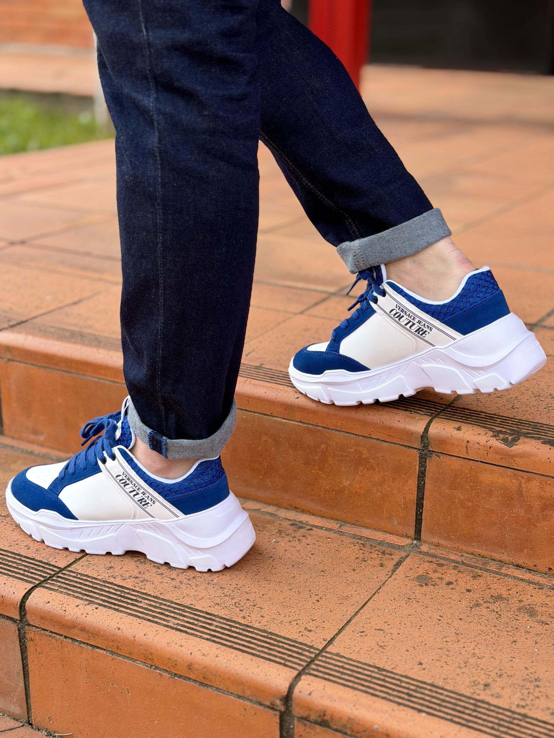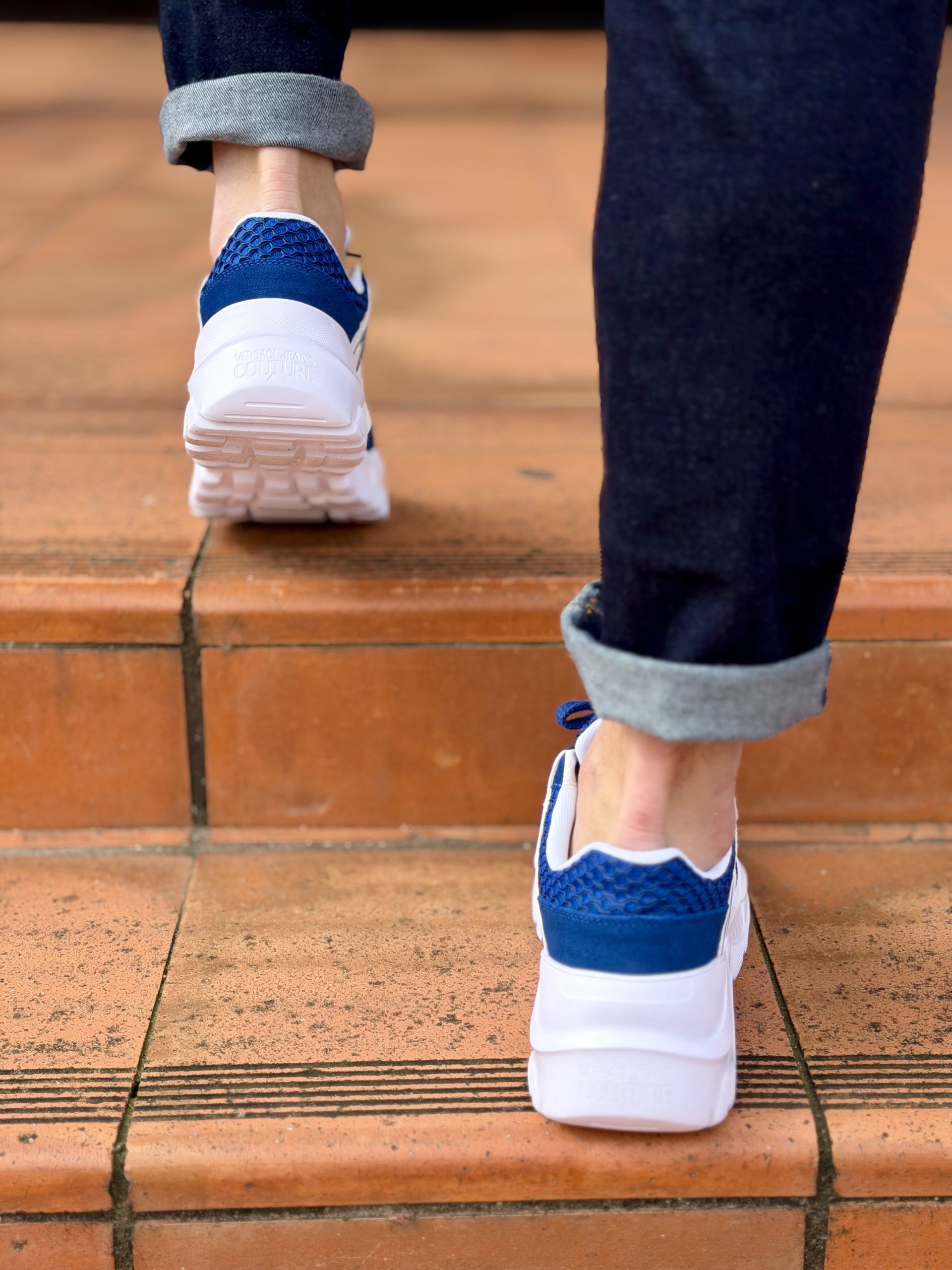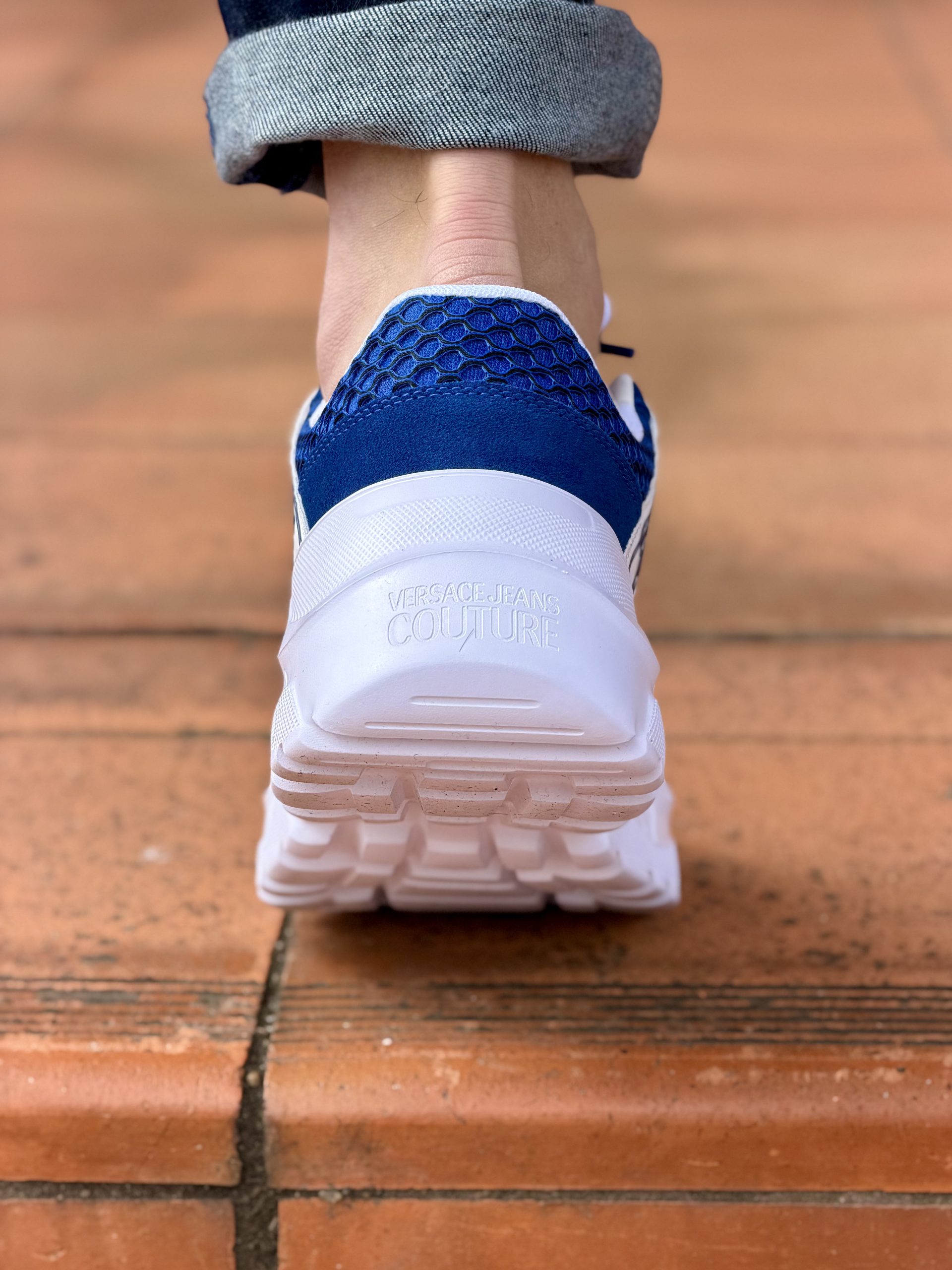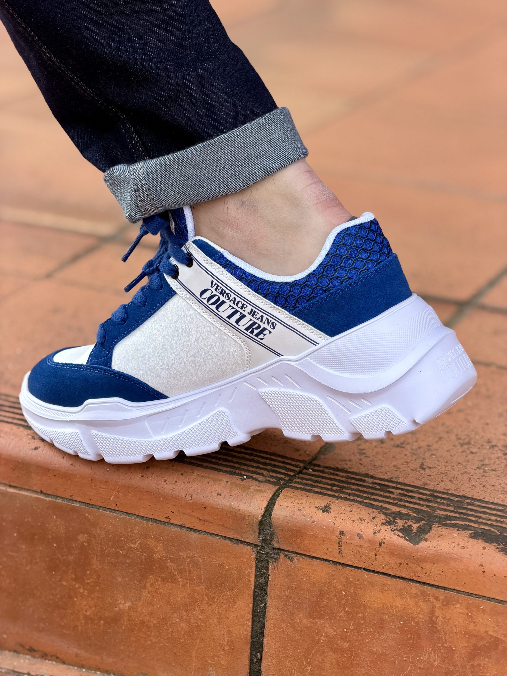 Imprima velocidade e sofisticação ao seu estilo com as sapatilhas Fondo Speedtrack da Versace Jeans Couture. Este modelo combina a estética dinâmica do calçado de performance com o luxo urbano, destacando-se pelo contraste marcante entre o branco imaculado e o azul royal profundo.