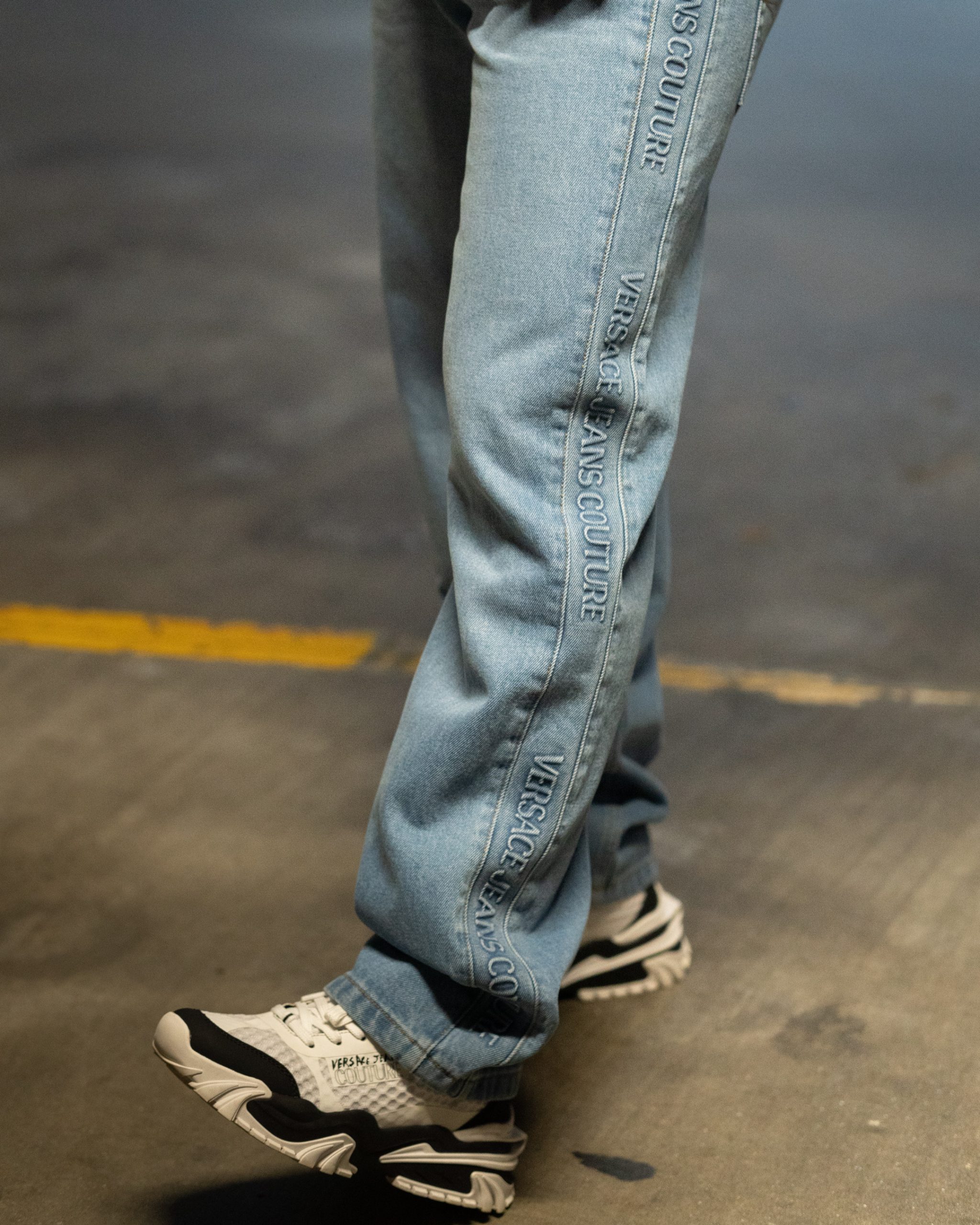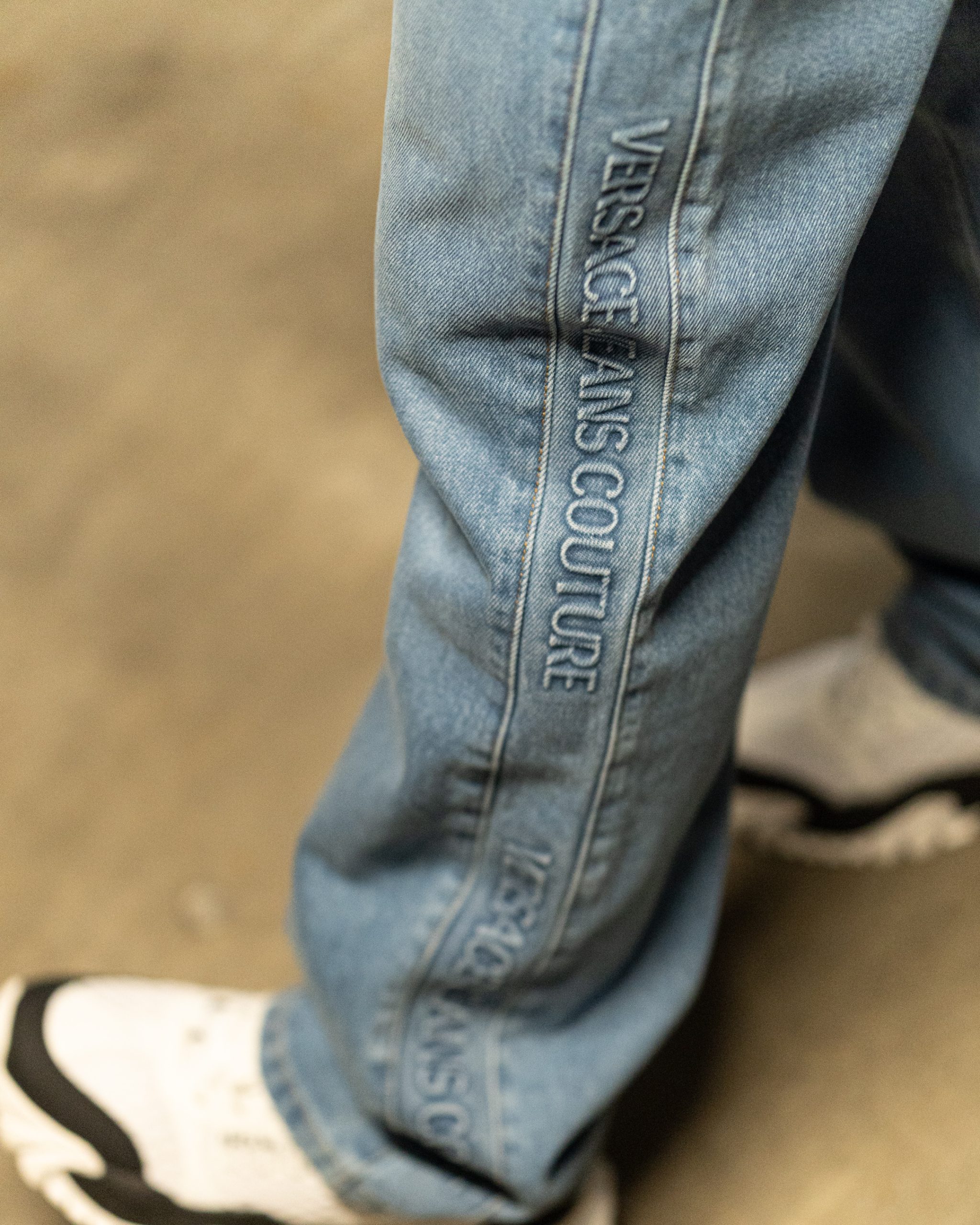 Ao longo da perna, apresenta a inscrição Versace Jeans Couture em relevo tonal, conferindo uma textura exclusiva e uma visibilidade premium sem ser excessiva. Os detalhes de acabamento, como os rebites personalizados e a costura contrastante, reforçam a qualidade artesanal e o ADN da marca italiana.