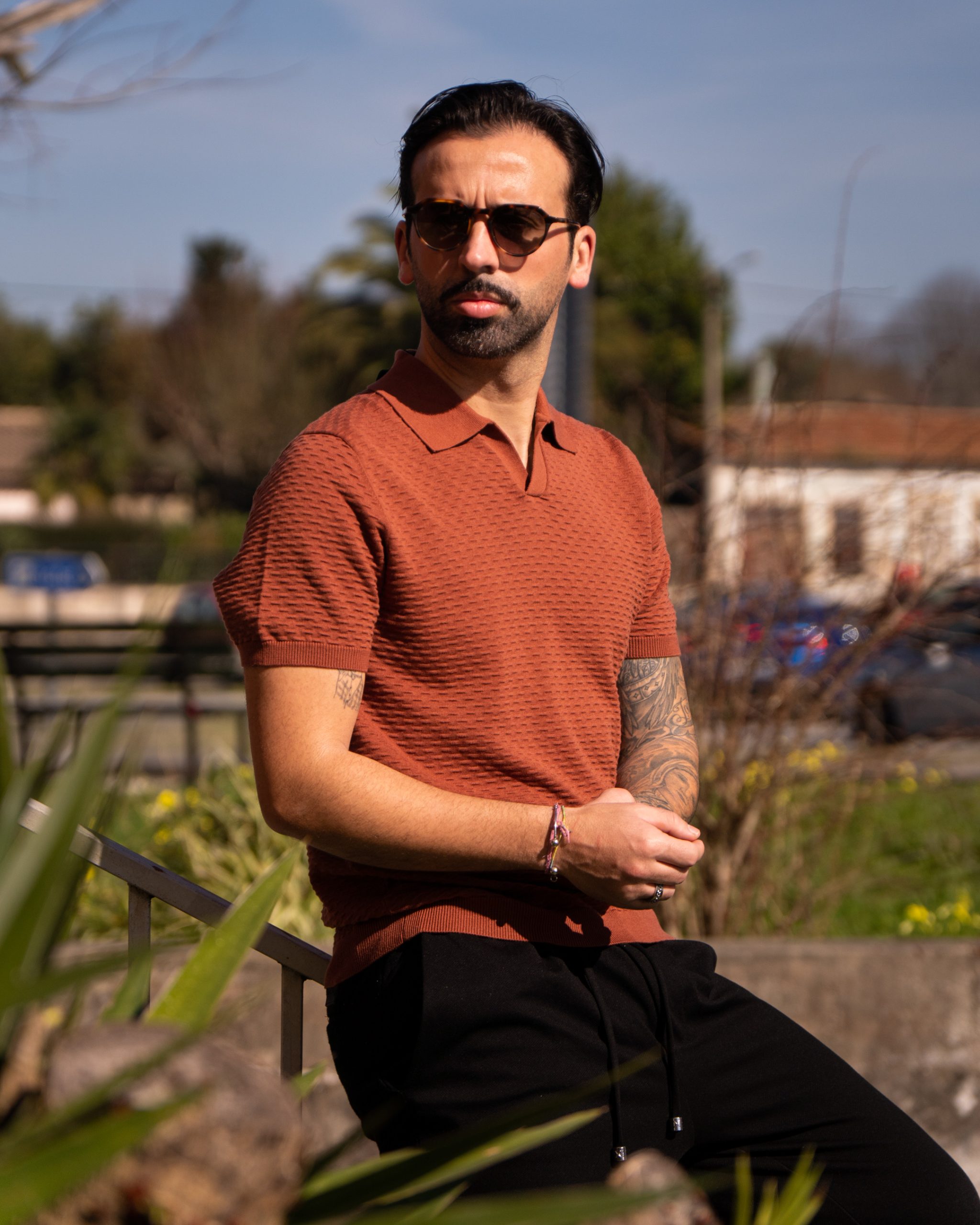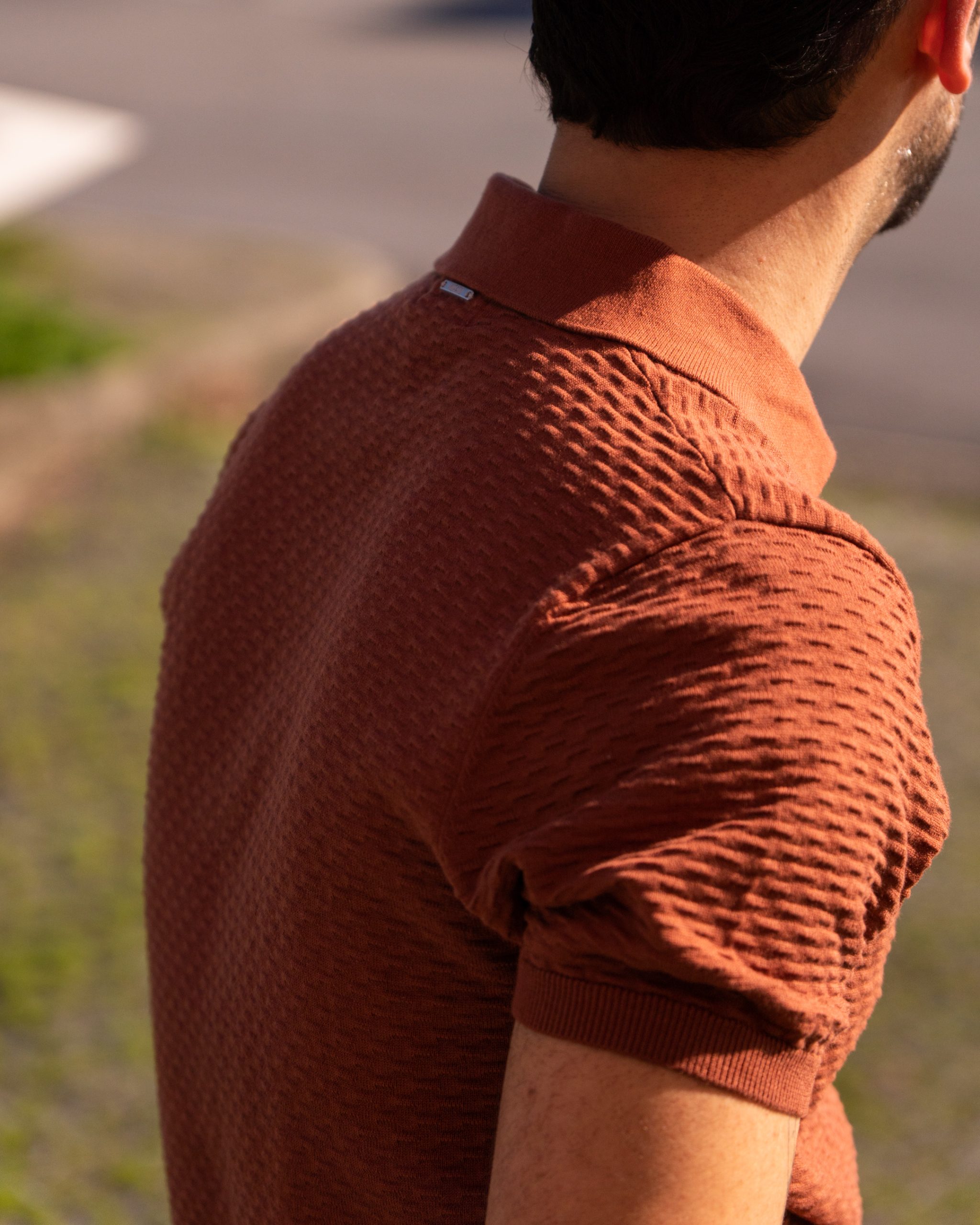 Este polo da Antony Morato redefine o conceito de “casual chic” através de uma textura rica e uma cor vibrante. Em tom terracota, uma das cores tendência da estação, a peça destaca-se pelo seu padrão de malha em relevo, que confere profundidade e um toque sofisticado ao design.