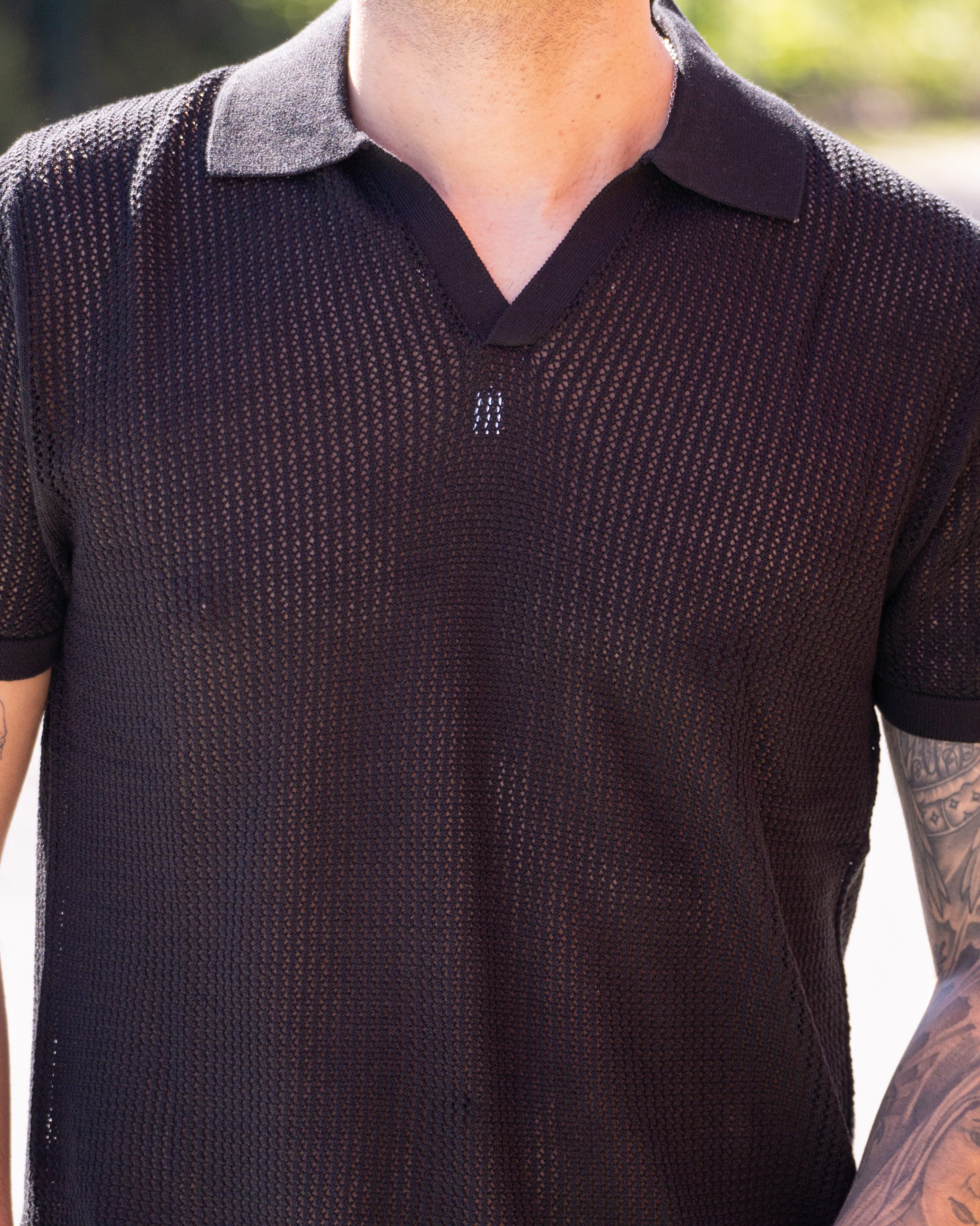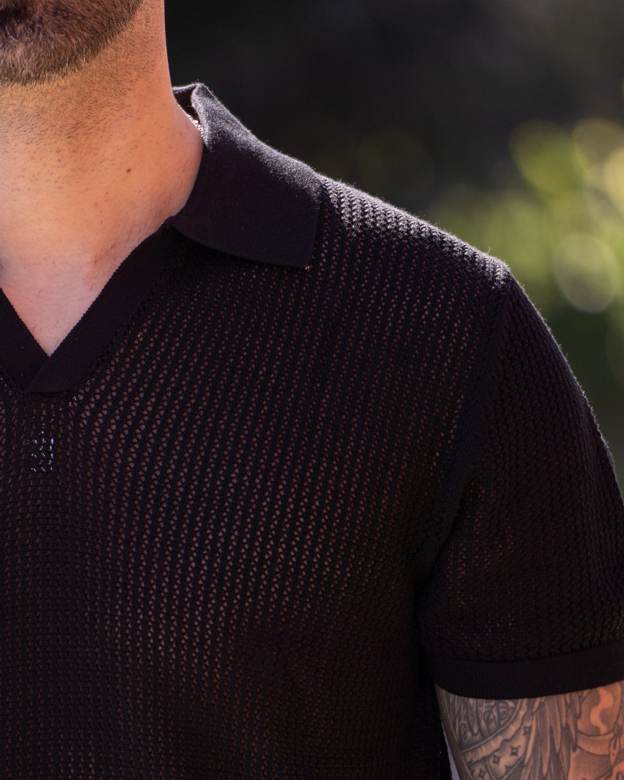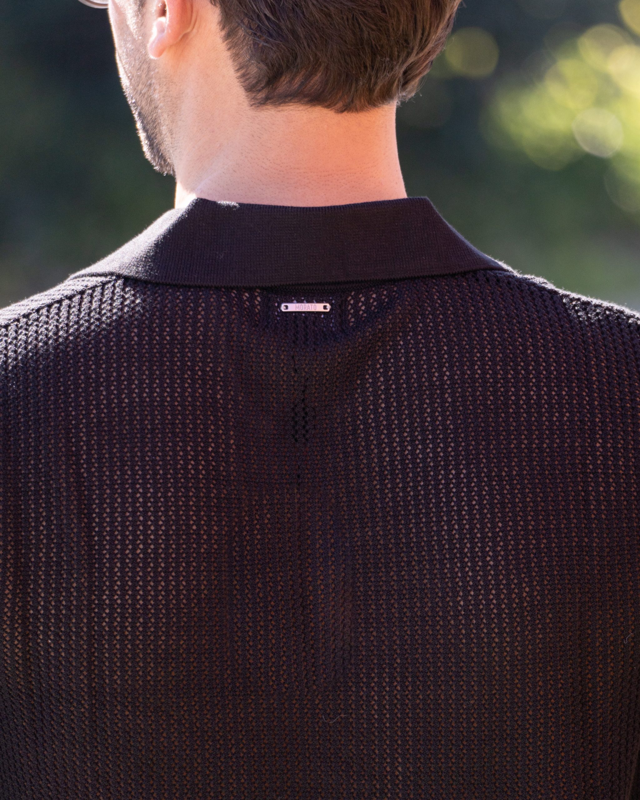 Este polo da Antony Morato em preto profundo é a peça definitiva para um look de verão sofisticado e fresco. Construído numa malha perfurada (mesh knit) de alta qualidade, oferece uma respirabilidade excecional e um jogo de texturas moderno.