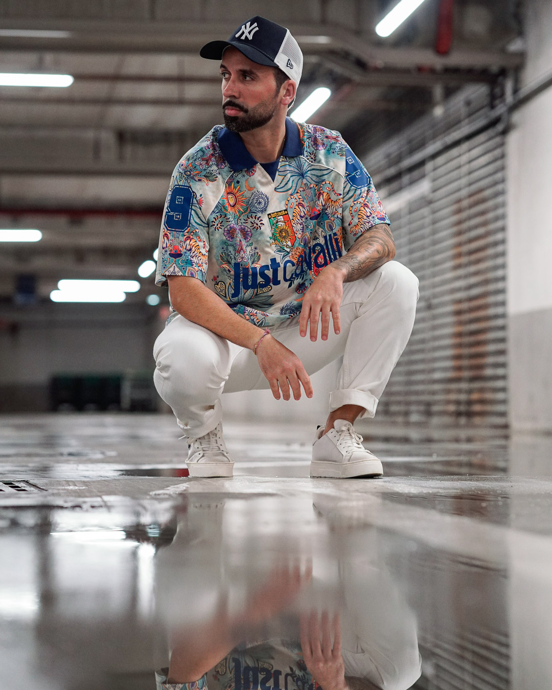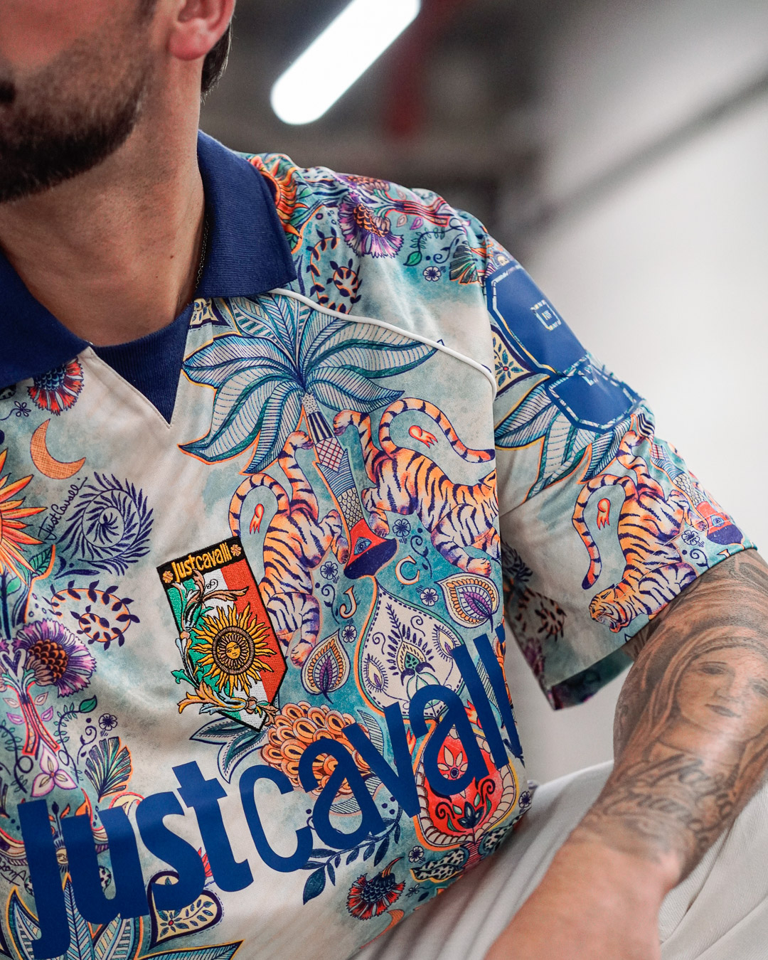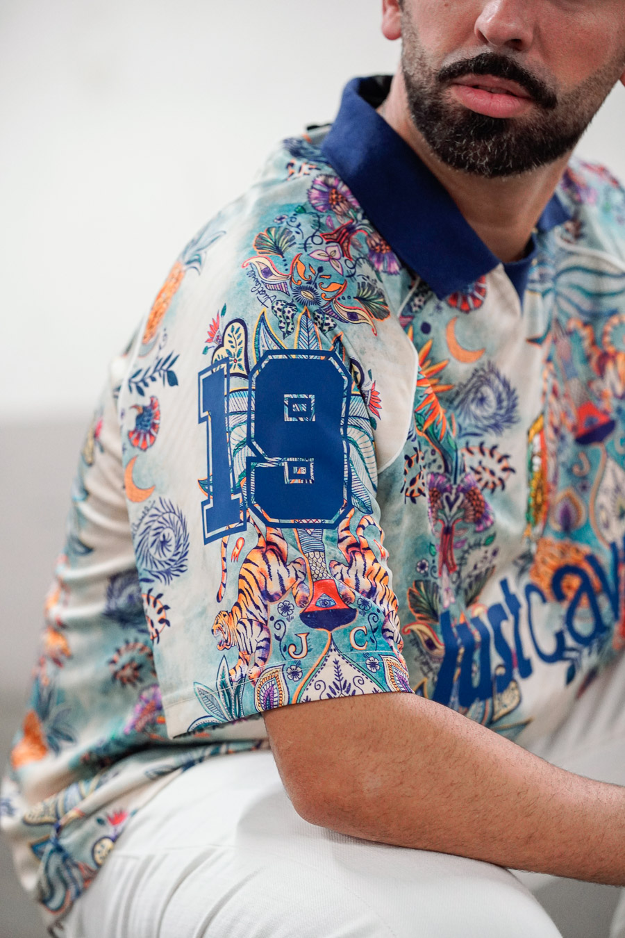 Este polo Just Cavalli é uma peça de coleção que redefine o conceito de sportswear de luxo. Com um design vibrante e eclético, apresenta um padrão integral que combina ilustrações de tigres, elementos tropicais e motivos ornamentais. A estética é inspirada nas camisolas de desporto clássicas, evidenciada pelo logótipo “Just Cavalli” em estilo universitário e o número “19” na manga.