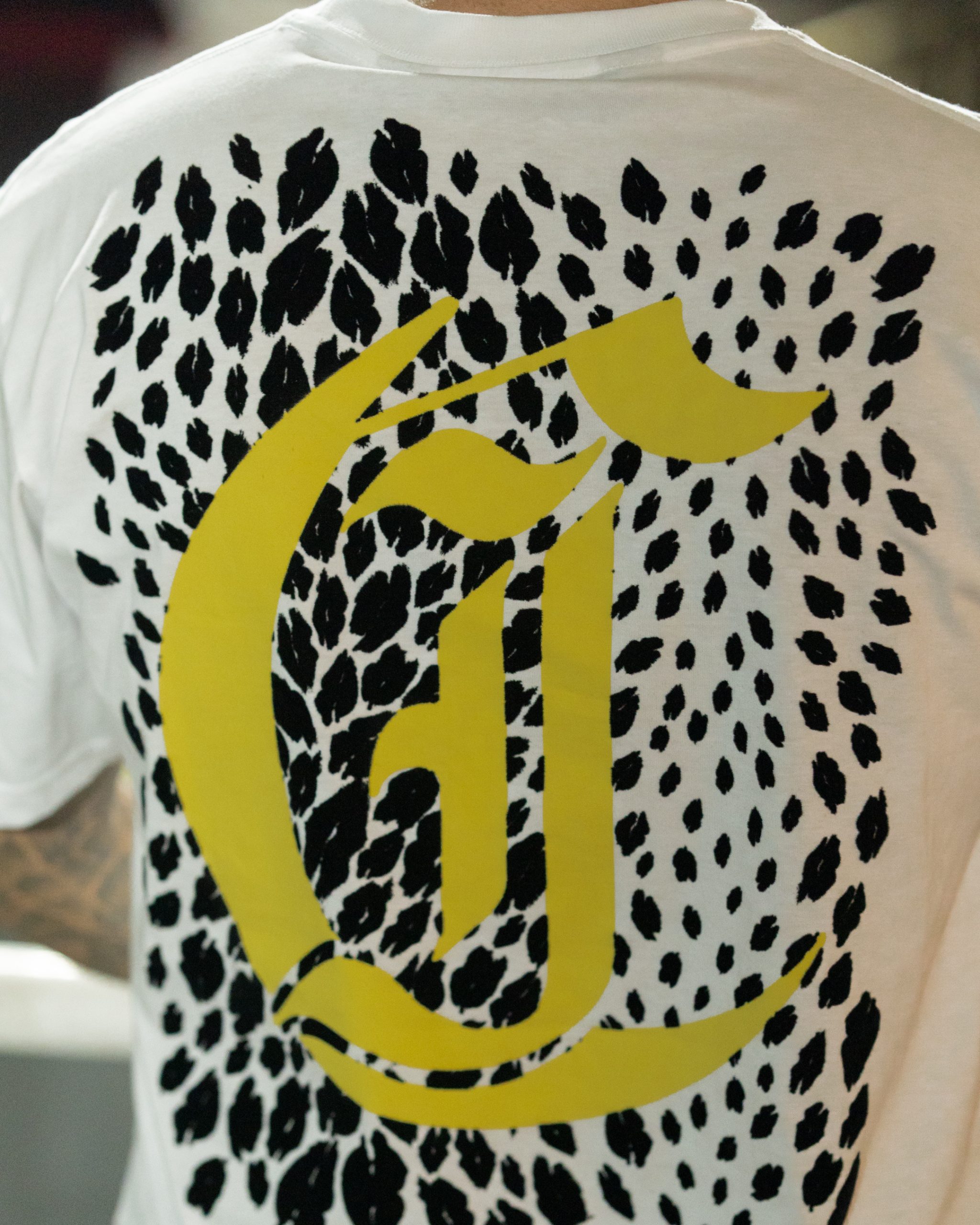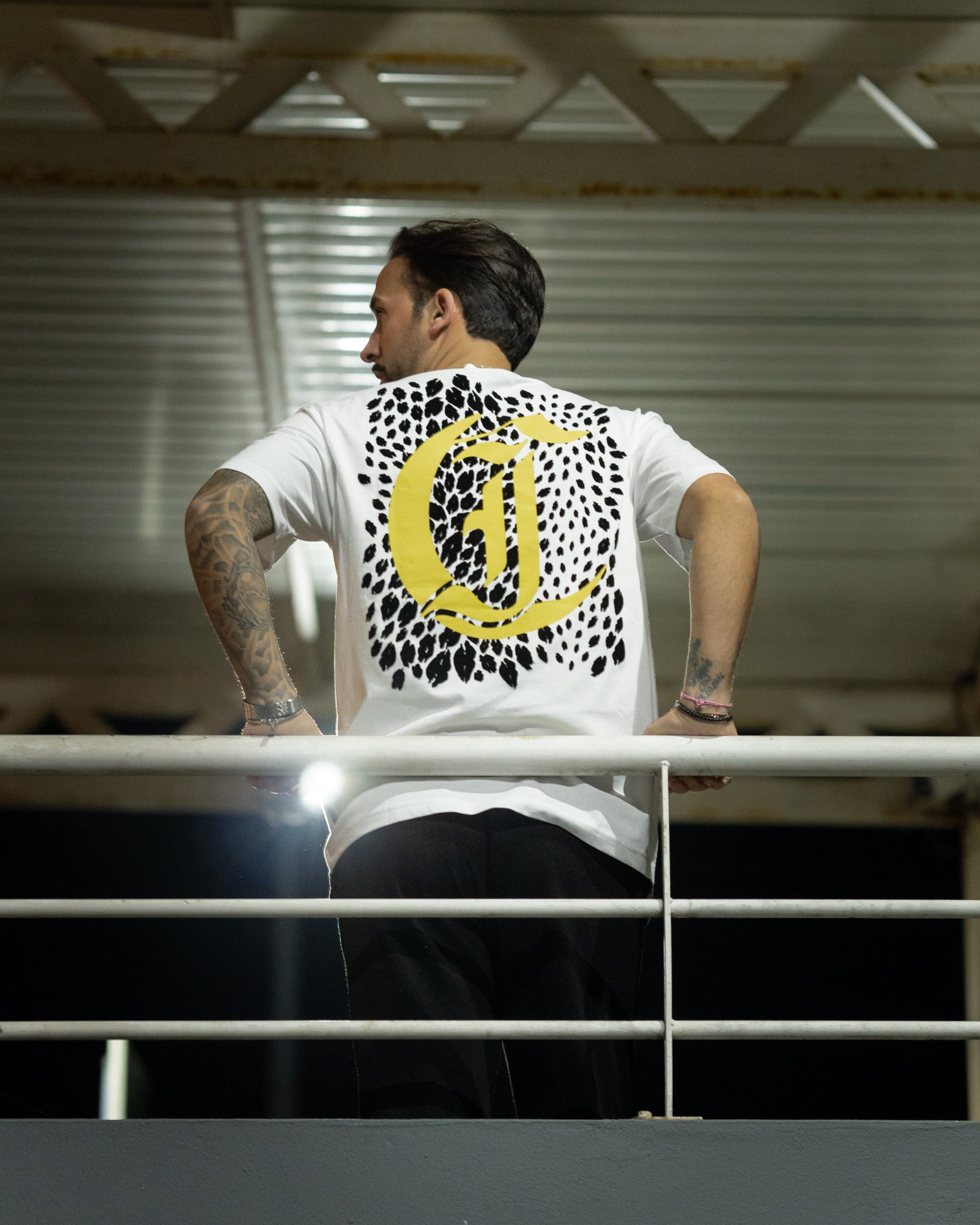 Nas costas, o destaque é absoluto: um grande monograma gótico em amarelo ocupa o centro da peça, enquadrado por um padrão de beijos/“spots” em preto, criando um efeito visual inspirado no animalier, típico do ADN Cavalli. O corte regular e o algodão macio fazem desta t-shirt uma escolha perfeita para looks urbanos de atitude.