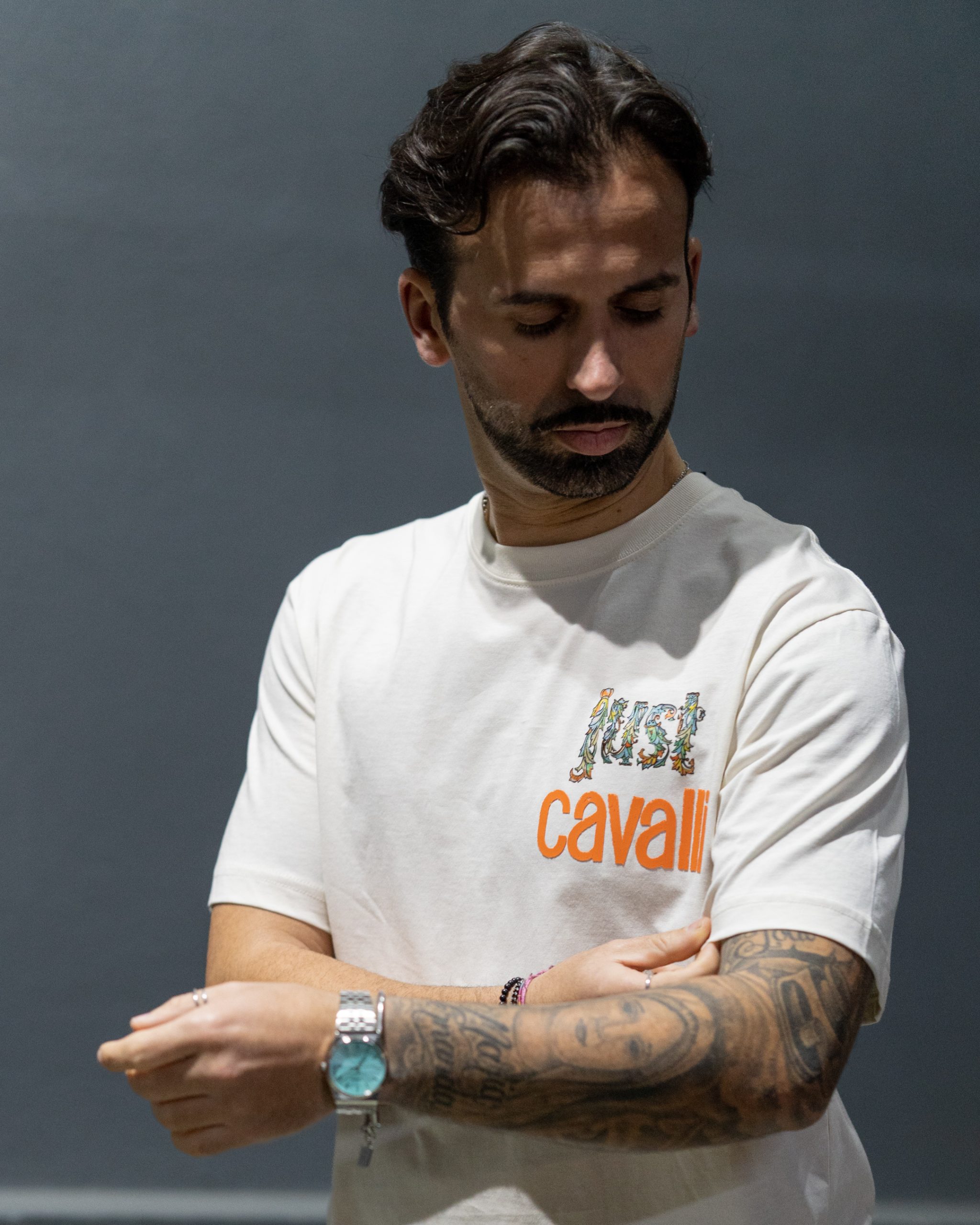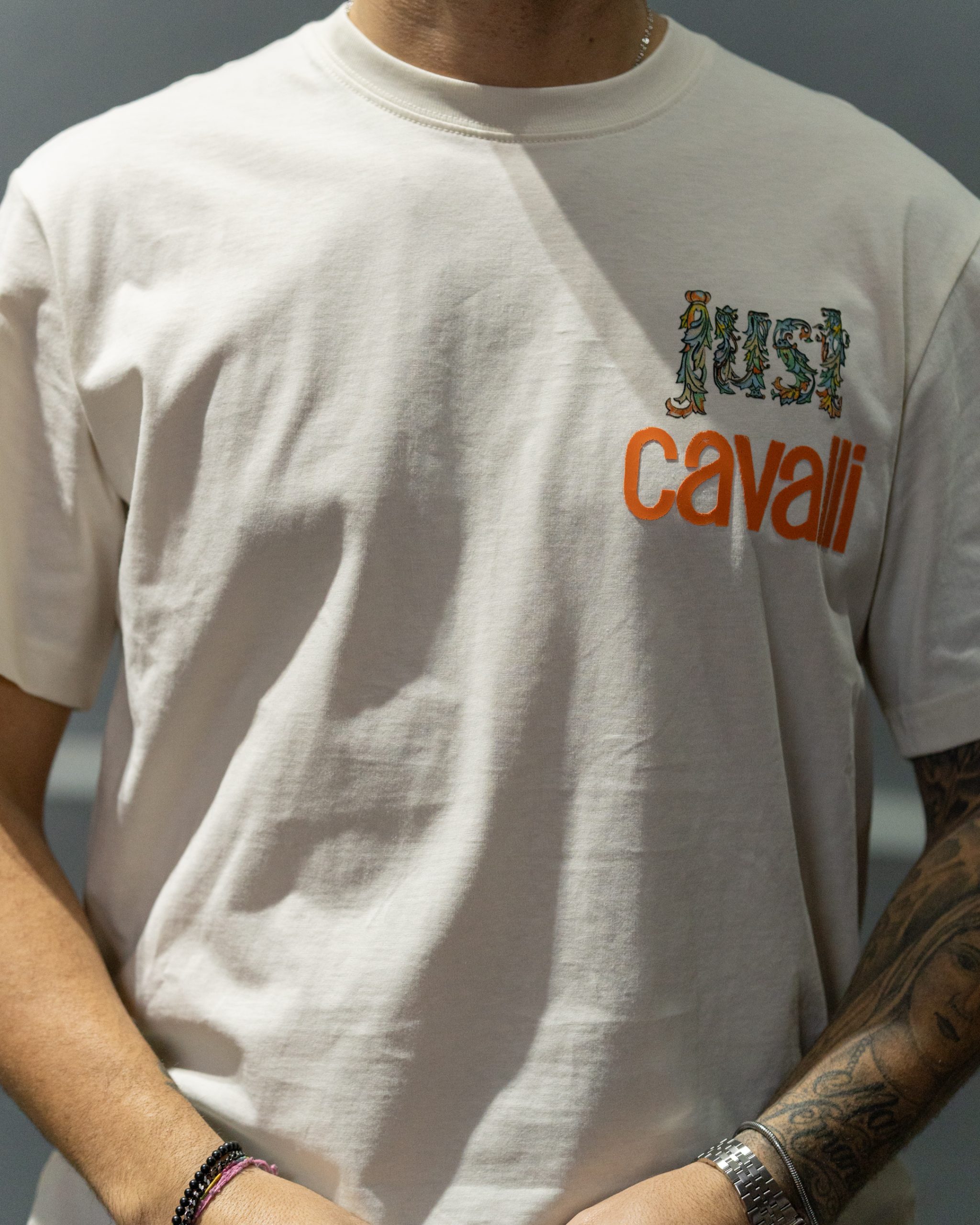 T-shirt Just Cavalli em tom off‑white, com um design clean à frente e foco total no logótipo. O peito apresenta a inscrição “Just Cavalli” em duas linhas, combinando a palavra Just com um efeito gráfico de ramos e folhas (small twigs) e o Cavalli em laranja vibrante, criando um contraste moderno e sofisticado.