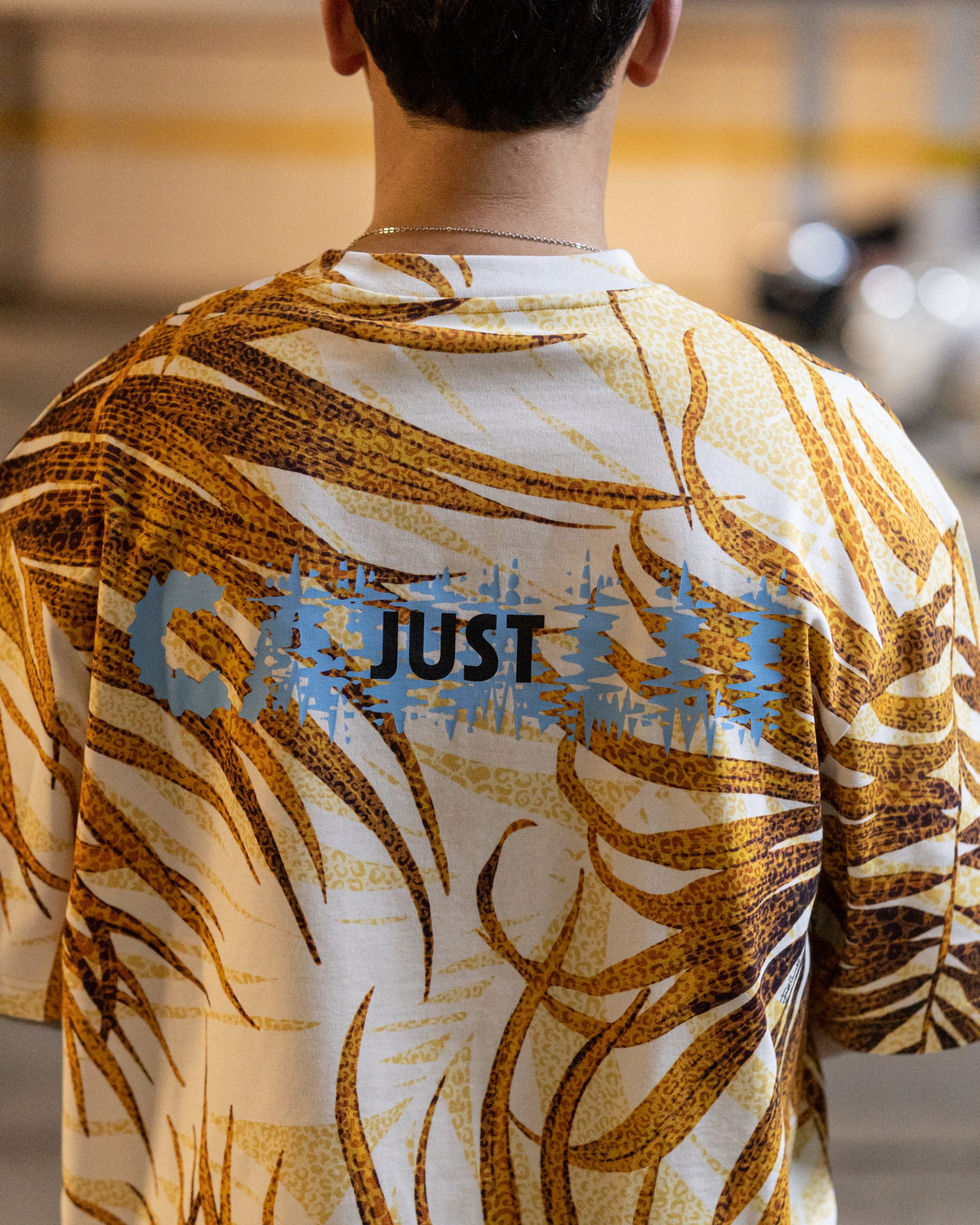 Na frente, o icónico monograma em azul dá um contraste fresco ao padrão quente. Nas costas, a inscrição gráfica “Just” em azul sobre fundo recortado reforça o ADN urbano da marca. O corte relaxed garante conforto máximo, ideal para looks de verão com identidade premium.